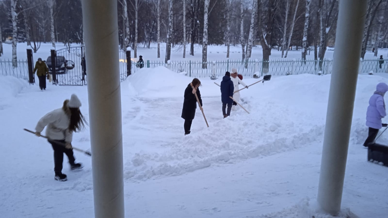 Студенты убирали снег с территории учебного заведения, очищали от наледи лестничные сходы; с привлечением спецтехники очищены от снежных навесов и наледи кровли.