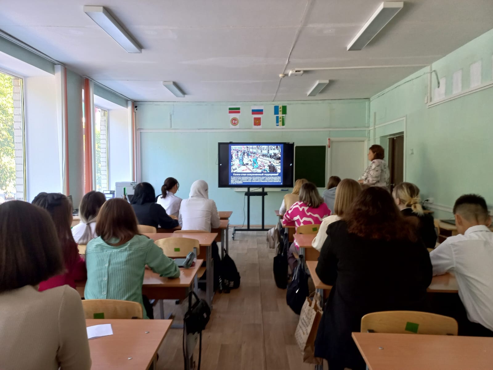 Для учащихся 1 и 2 курсов был проведен час памяти «Трагедия не должна повториться». Целью мероприятия было рассказать студентам о том, что такое терроризм, как ему противостоять и об основных правилах поведения в условиях угрозы терактов. Особое внимание было уделено страшной трагедии Беслана и необходимости солидарности в борьбе против угрозы терроризма.