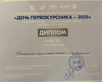 В результате наша команда завоевала второе место, с честью представив колледж! Поздравляем студентов Нижнекамского педагогического колледжа с успешным выступлением и благодарим за яркий номер! Ваш талант — это настоящая гордость для нас всех!