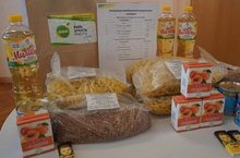 В набор вошли макаронные изделия, гречка, котлеты, сахарный песок, подсолнечное масло, сок, сгущенное молоко, сладости и многое другое. -