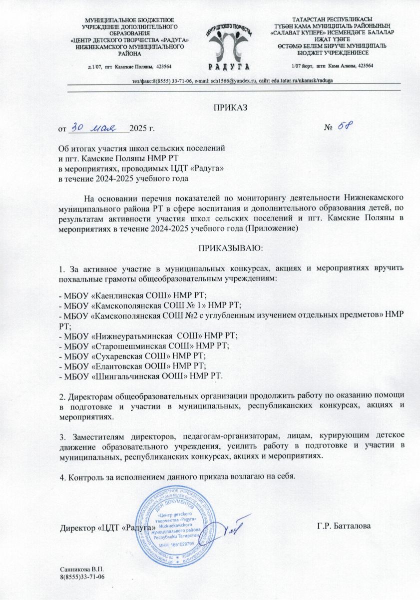 Приказ №58 от 30.05.2025г. об итогах участия школ сельских поселений и пгт Камские Поляны НМРТ РТ в мероприятиях, проводимых в течение 2024-2025 учебного года наградные материалы Похвальные грамоты