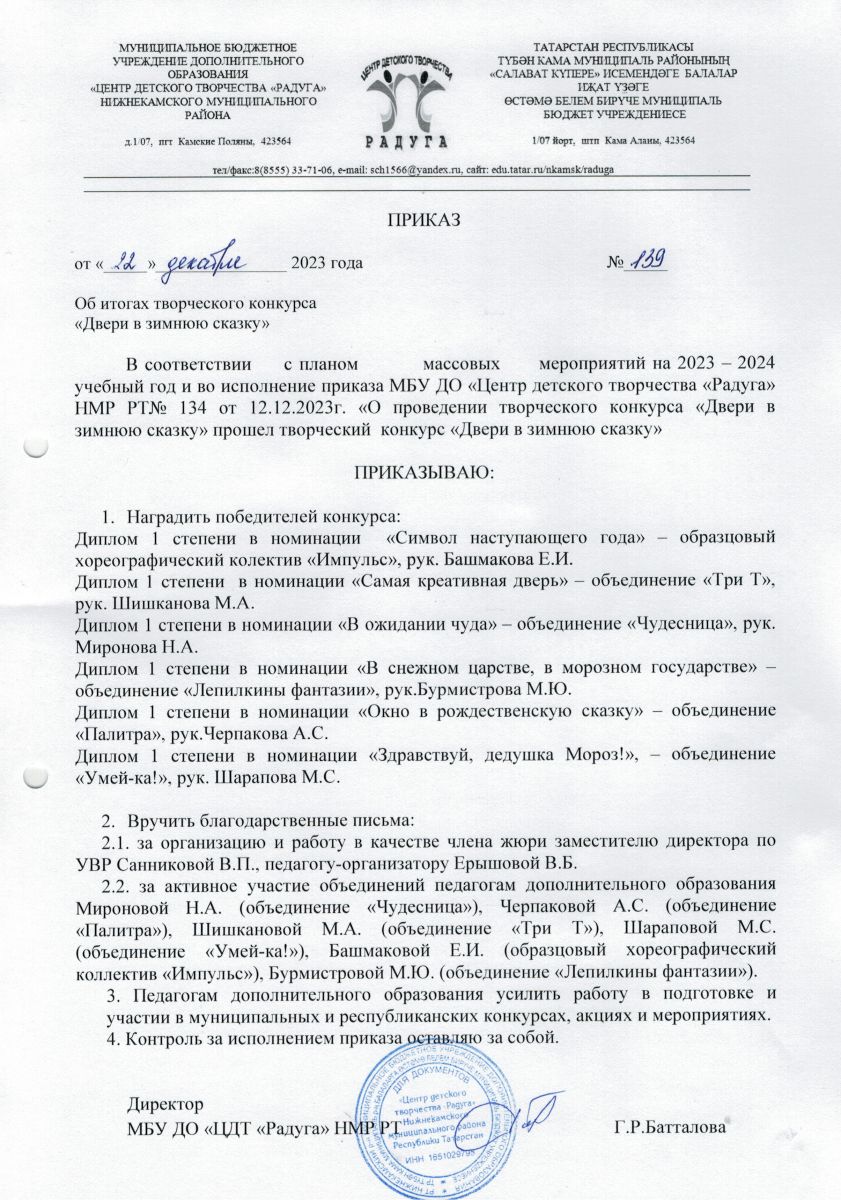 Приказ №139 от 22 декабря 2023 года "Об итогах творческого конкурса "Двери в зимнюю сказку"
