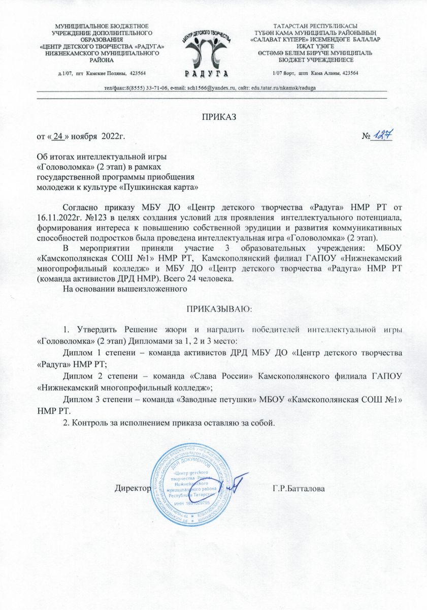 Приказ № 50 от 20.05.2024 г. "Об итогах проведения муниципальных акции "Георгиевская ленточка", "Жить и помнить" среди ОУ сельских поселений НМР и пгт. Камские Поляны наградные материалы Георгиевская ленточка https://cloud.mail.ru/public/kTcn/PrFVvzq78 Жить и Помнить https://cloud.mail.ru/public/sJGp/t2GXLXANq