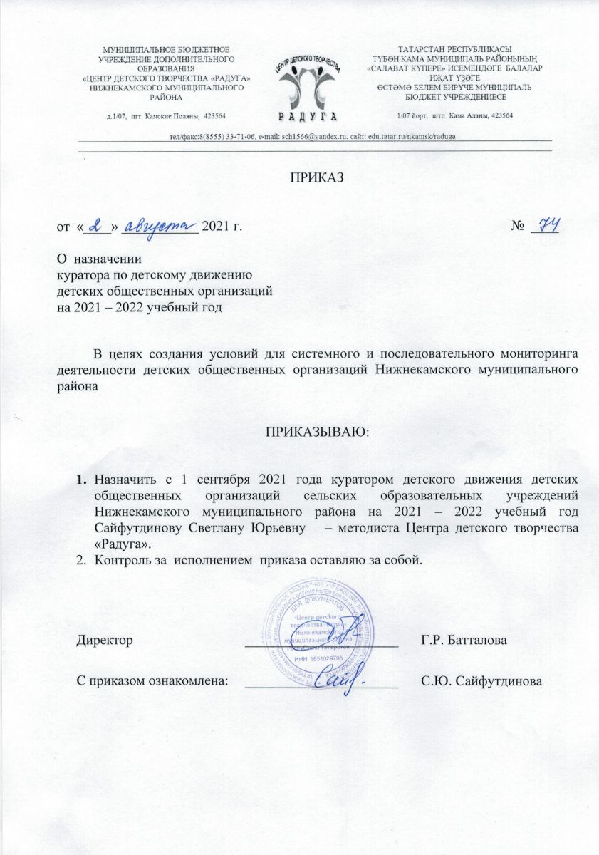 О назначении куратора по детскому движению на 2021-2022 учебный год