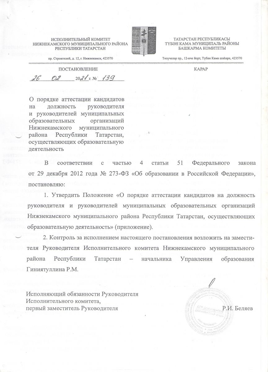 - Постановление о порядке аттестации кандидатов на должность руководителя и руководителей муниципальных образовательных организаций НМР РТ осуществляющих образовательную деятельность