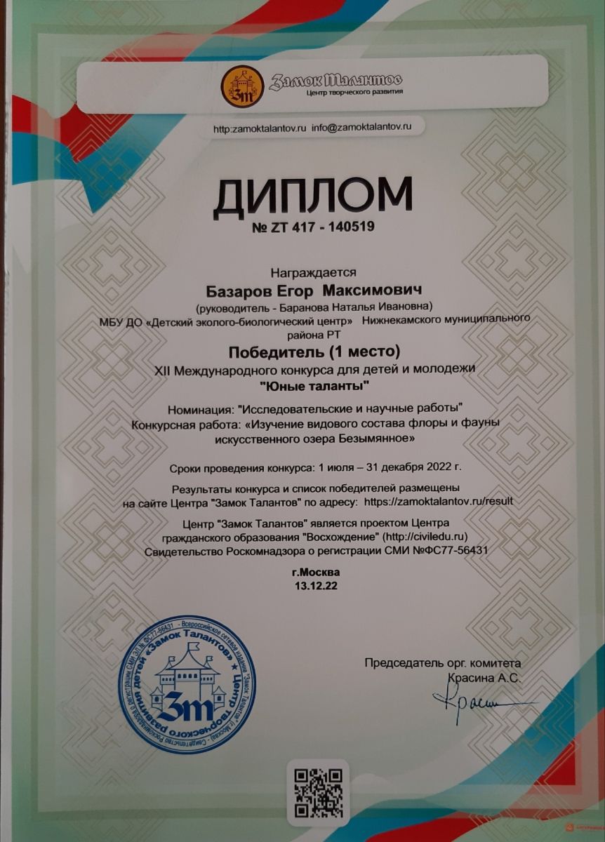 Учащийся 9 класса Базаров Егор стал Победителем, заняв 1 место в номинации "Исследовальские и научные работы" (старшая возрастная подгруппа), представив свою конкурсную работу "Изучение видового состава флоры и фауны искусственного озера Безымянное".