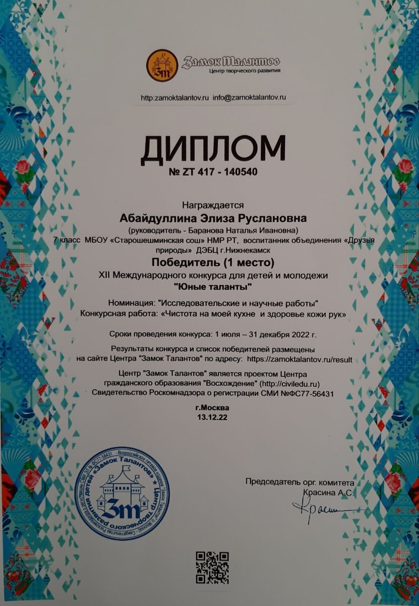 Учащаяся 7 класса Абайдулинна Элиза стала Победителем, заняв 1 место в номинации "Исследовальские и научные работы" (средняя возрастная подгруппа), представив свою конкурсную работу "Чистота на кухне и здоровье кожи рук".