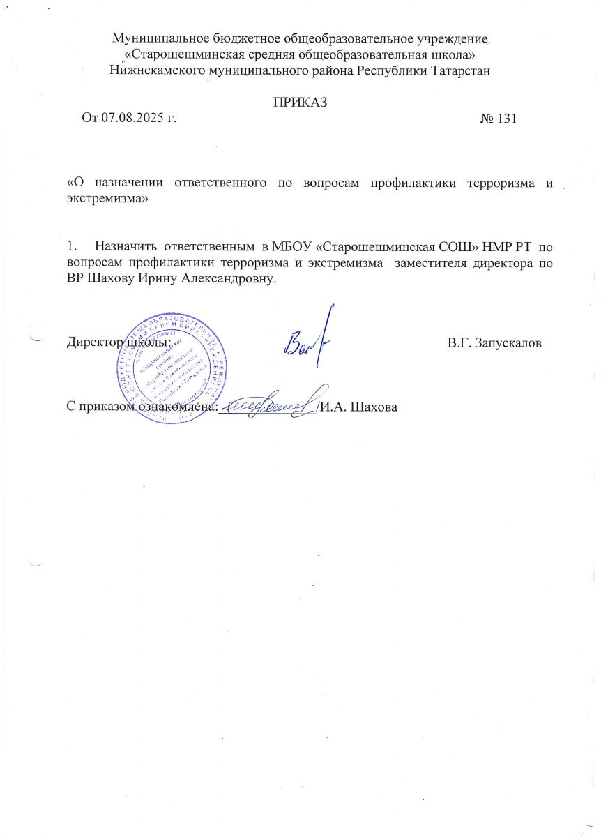 Приказ о назначении ответственного по вопросам профилактики терроризма и экстремизма.
