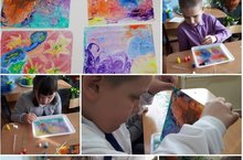 На уроке рисования, учащиеся 4а класса с классным руководителем Лебедевой С.В окунулись в технику древнего востока. Рисовали на воде снежные узоры Деда Мороза.