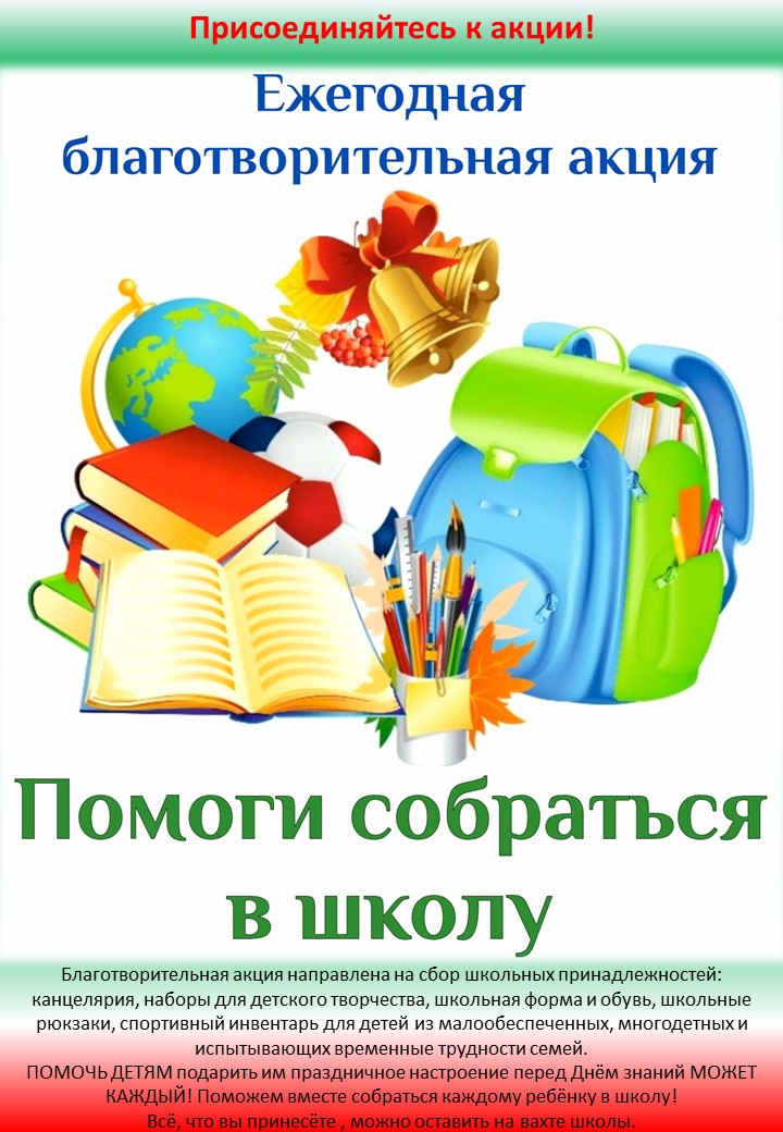Благотворительная акция направлена на сбор школьных принадлежностей: канцелярия, наборы для детского творчества, школьная форма и обувь, школьные рюкзаки, спортивный инвентарь для детей, воспитывающихся в малообеспеченных, многодетных, неблагополучных, приемных семьях, семьях родителей-инвалидов, семьях опекунов, семьях безработных родителей, детях-инвалидах, которые пойдут в первый класс 1 сентября 2024 года; учащихся 2 – 11 классов, нуждающихся в благотворительной помощи.