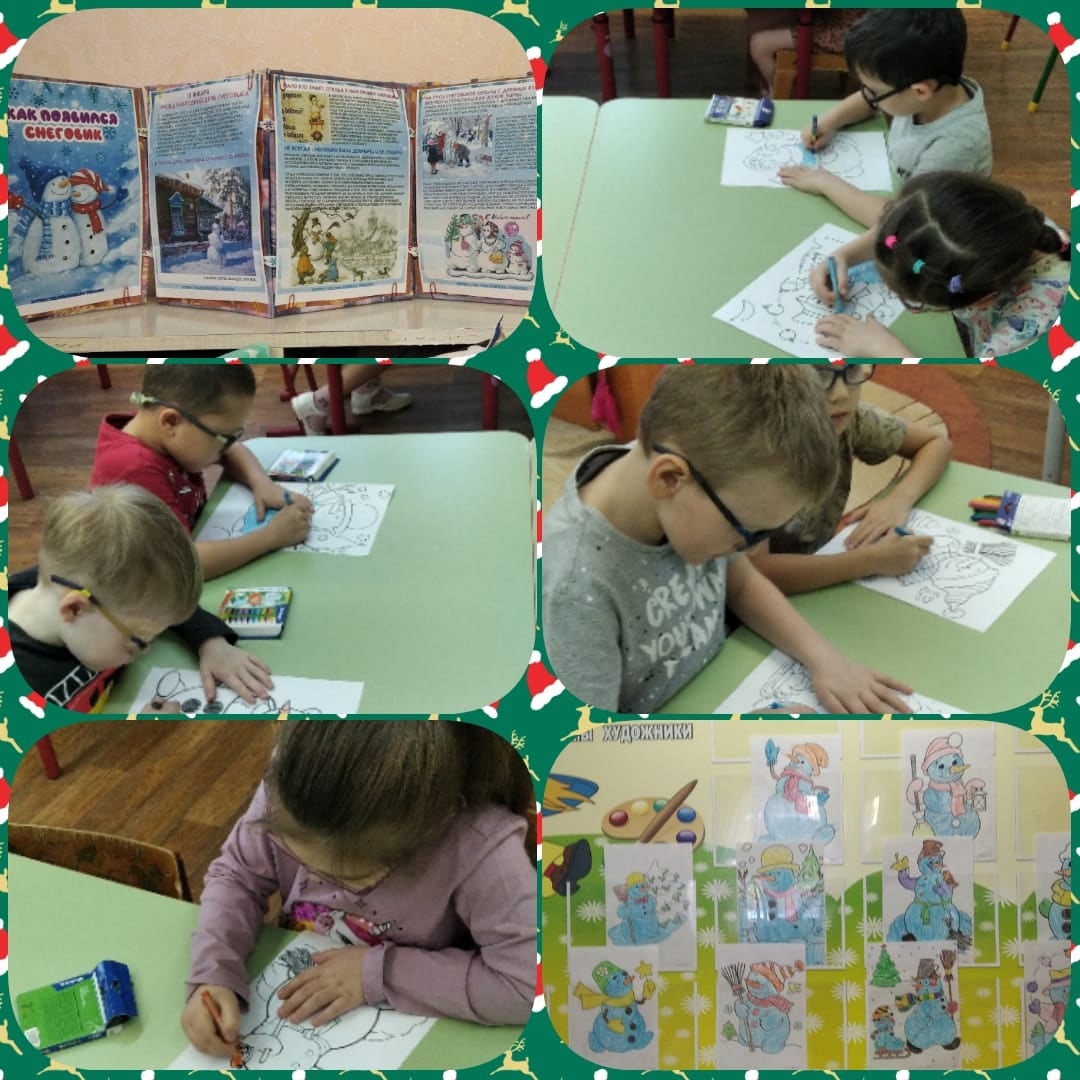 дети раскрасили раскраски и устроили выставку детских работ под названием "Весёлый снеговичок".