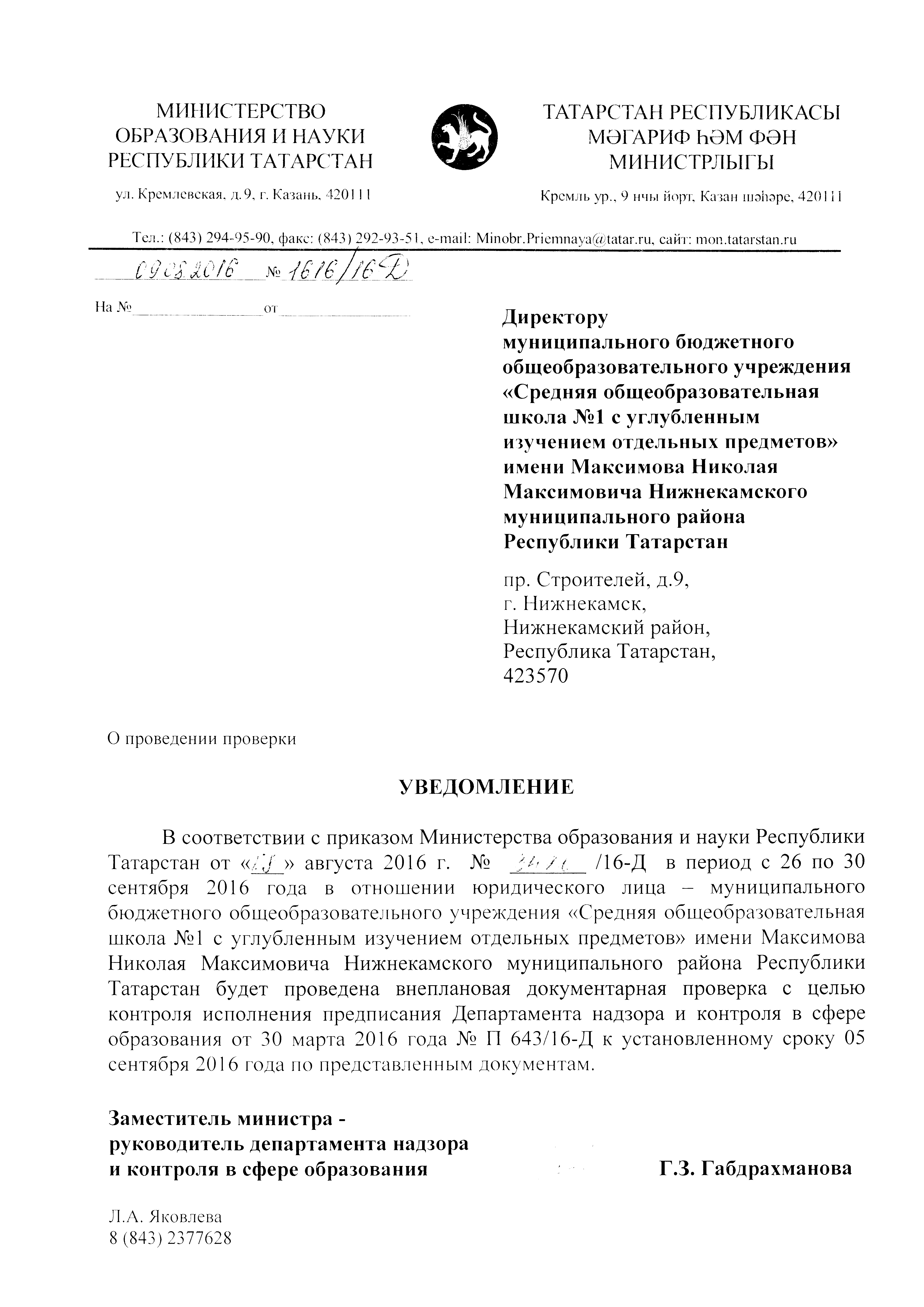 Муниципальное бюджетное общеобразовательное учреждение "Средняя общеобразовательная школа №1 с углубленным изучением отдельных предметов" имени Максимова Николая Максимовича Нижнекамского муниципального района Республики Татарстан