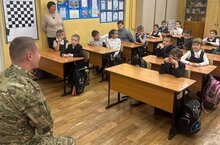 Наш гость в зоне СВО находится с первых дней. Он имеет позывной - Нефть., приехал в краткосрочный отпуск, зашел в школу, где учится его дочь, чтобы пообщаться с нашими детьми.