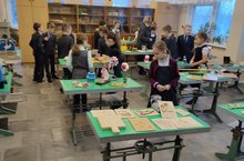 В рамках предметной недели по технологии учитель Жданова М.А. в 5 Д классе провела урок-игру «Ателье». Девочки учились подбирать ткани, подходящие по составу и цветовой гамме к летнему костюму для девочки, рисовать эскизы, подбирать аксессуары, защищать готовые проекты.