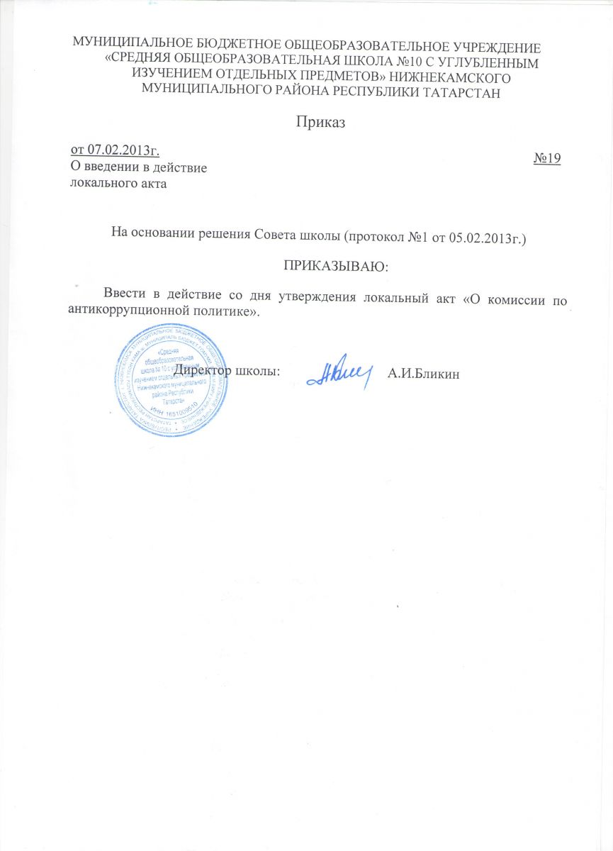 О введение в действие локального акта О комиссии по антикоррупционой политике