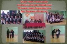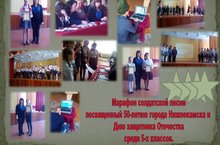 В рамках месячника гражданско-патриотического воспитания прошел марафон солдаткой песни, посвященный 50-летию города Нижнекамска и Дню защитника Отечества среди 5-х классов. Вся атмосфера в зале была наполнена духом военных лет, гордостью за свою страну, за свой родной город. Жюри оценивало соответствие тематике, художественное мастерство, умение держать себя на сцене.