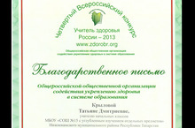 22 ноября 2013 года в г. Ульяновске завершился финальный этап IV Всероссийского конкурса «Учитель здоровья России-2013». Учитель начальных классов Крылова Татьяна Дмитриевна успешно выступила в финале и была награждена Благодарственным письмом. Всего в конкурсе участвовали 47 педагогов из различных регионов Российской Федерации, это в два раза больше чем было в 2012 году.
