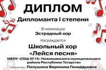 "Лейся песня" коллективы I ачык фестиваль - хор коллективлары конкурсында 1 дәрәҗәдәге дипломант булды. Җитәкчесе: Полушина В. Г.