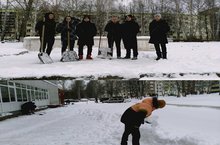 Уборка территории 9а классом. Снегопад- это когда снег падает на ресницы, а дети играют в снежки. Снегопад- это красиво, но нужно его убирать с территории школы.