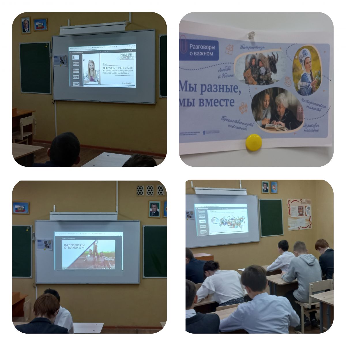Учащиеся 7 в класса в рамках классного часа " Разговоры о важном" обсудили тему" Мы разные, мы вместе". Говорили о том, что народы России объединяют духовно- нравственные ценности, человеколюбие и справедливость, воля и вера в добро, любовь к полному языку.