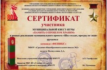 Команда 6 А класса ( кл. рук. Гильмутдинова Г. Р.) «Феникс» приняла участие в квест-игре «ПАМЯТЬ О ПРОШЛОМ ХРАНИМ». Ребята получили возможность не только поучаствовать в увлекательных испытаниях, но и погрузиться в изучение исторического наследия своей страны.Команда «Феникс» достойно проявила себя и вошла в пятерку лучших команд нашего города , заняв 4-е место.Поздравляем и желаем дальнейших побед. Дальше - больше!