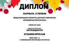 Кузьмин Ярослав и Агзамович Ранель, учащиеся 3 В класса, стали победителями международного конкурса детского творчества « Осенняя мастерская 2023».