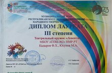 Школьный театр «Ливентик» стал призером III степени муниципального этапа Республиканского детского фестиваля народного творчества «Без бергэ». Поздравляем ребят с успешным выступлением. Благодарим за работу руководителя кружка Кадырова Фанис Хасиповича