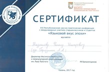 17 февраля 2017 года в г. Казань в Институте филологии и межкультурной коммуникации им. Льва Толстого КФУ состоялась XVI Республиканская научно- практическая конференция с международным участием «Языковой вкус эпохи», где участвовали в секции «Интегрированное изучение школьных предметов» ученик 8 А класса Назмиев Фанис и учитель русского языка и литературы, татарского языка и литературы ГарифуллинаЛейсанАнасовна .