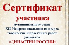 Поздравляем Фокину Александру, ученицу 5 «А» класса, в участии муниципального этапа XII Межрегионального этапа творческих и проектных работа учащихся «Династии России»! Руководитель- Гарифуллина Л.А.
