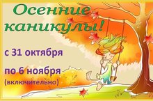 Уважаемые обучающиеся и родители! Напоминаем, что осенние каникулы начнутся с 31 октября и продлятся по 6 ноября включительно. В школу выходить 7 ноября (в среду). Желаем всем хорошего настроения и продуктивного отдыха!