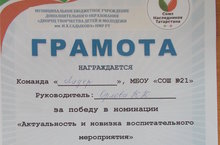 На городском итоговом мероприятии "Актив года" во Дворце творчества детей и молодежи им. Садыкова было награждение ДОО за участие в конкурсах. Совет старшеклассников ДОО "Лидер" нашей школы был награжден грамотой за победу в номинации "Актуальность и новизна воспитательного мероприятия"