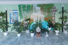 В рамках подготовки к муниципальному конкурсу по лучшему озеленению было закончено оформление зеленого уголка на 1 этаже в рекреации начального блока. Композиция посвящается 50-летию родного города и называется "50 лет еще только начало". Оформление стены выполнила учитель ИЗО и труда Потапова Оксана Ивановна, зеленое оформление учитель биологии Шумкина Н.П.