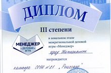 На базе нашей школы 17 марта 2015 года прошел зональный этап межрегиональной деловой игры "Менеджер - 2015". Игра проходила в виде командного соревнования. Команда нашей школы под руководством учителя обществознания и истории Мингазовой Е.В. была награждена дипломом III степени. Поздравляем!