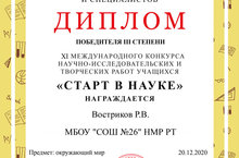 Ученик 2 Б класса Востриков Роман принял участие во Всероссийском конкурсе «Краеведы России» Академии народной энциклопедии Международного инновационного проекта «Моя Отчизна» и получил Диплом Победителя по направлению «Экология».