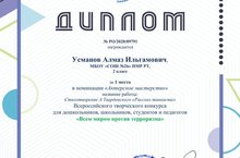 Ученик 2Б класса Усманов Алмаз принял участие в Всероссийском конкурсе для школьников «Всем миром против терроризма» в номинации «Актёрское мастерство» и получил Диплом за 1 место.