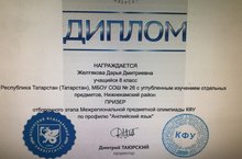 Желтякова Дарья, ученица 8 А класса, проявляет высокие способности в изучении английского языка, она участвует в различных дистанционных конкурсах и олимпиадах всероссийского, регионального и муниципального масштаба. Она является победителем осеннего и зимнего этапов Республиканской очной олимпиады "Win kid-2020", победителем Международного конкурса игры "Английский лев - 2020" и призером Межрегиональной предметной олимпиады КФУ по профилю "Английский язык". Учитель английского языка: Вьюкова В.В.