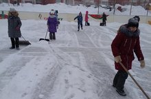 Уже на один раз в эту снежную зиму ребята 4 Б класса помогают убирать снег в школьной хоккейной коробке.