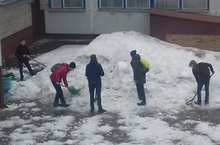 Экологическая акция "Чистая школа " в рамках массового городского субботника -1 этап : рыхление и разбрасывание снега.