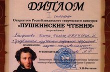 23 марта 2016 года в 78 лицее города Набережные Челны прошел I Всероссийский (VII Республиканский) открытый творческий конкурс "Пушкаинские чтения".Нашу школу на этом конкурсе представили: Сафиуллин Ильназ 10 класс (Руководитель - Полуляхова Наталия Алексеевна); Епифнова Илона (Руководитель -Волкова Марианна Романовна); Фалин Алексей,Ерашов Олег (Руководитель - Сабанаева Гюзель Рашидовна).