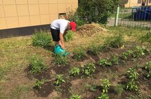 Продолжается трудовой десант 7А класса , ребята работают на пришкольном огороде , ухаживают за цветами , убирают территорию школы