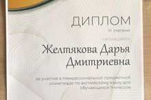 Желтякова Дарья, ученица 9 А класса, стала обладателем диплома III степени в Межрегиональной предметной олимпиаде по английскому языку на базе Альметьевского государственного нефтяного института. Поздравляем! (учитель Вьюкова ВВ)