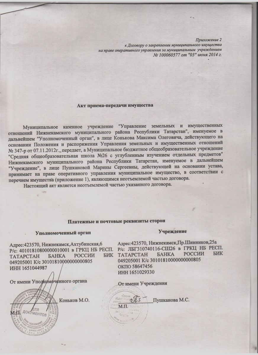 Договор о закреплении муниципального имущества на право оперативного управления за муниципальным учреждением № 100060557