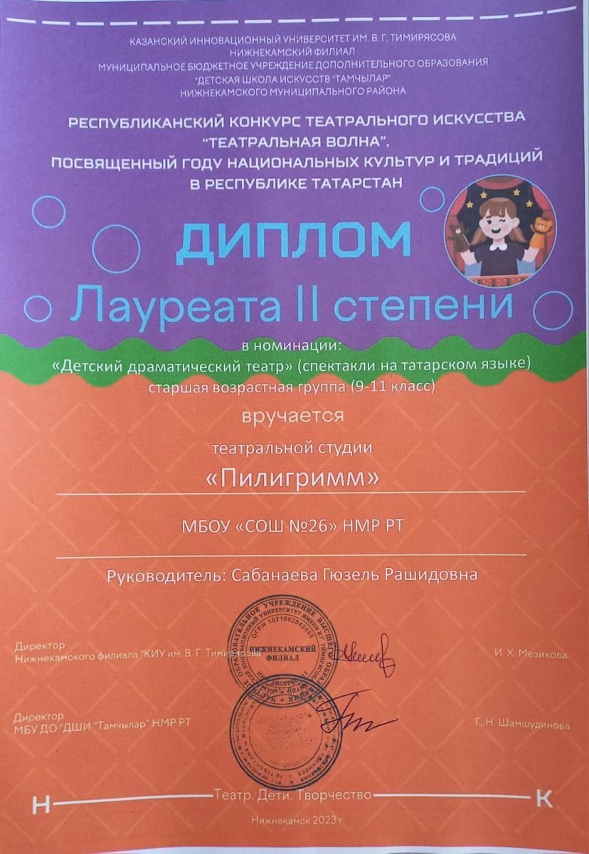 Школьный театральный коллектив "Пилигрим" в текущем учебном году стал призёром и победителем республиканских и международных творческих конкурсов.