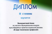 Валиахметова Алина, ученица 11 "а" класса награждена Дипломом 3 степени за участие в Муниципальном конкурсе мультимедийных проектов социальной рекламы "Вмире технических профессий". Руководитель: Абизяева В.Н.
