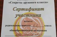 Поздравляем родительский комитет 6А класса и классного руководителя Петашеву Ольгу Вениаминовну с сертификатом участика в муниципальном этапе конкурса родительских комитетов "Секреты дружного класса".