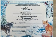Поздравляем ученика 4В класса Шалфеева Семена (классный руководитель Карамова Миляуша Зулфатовна) с дипломом за 3 место в муниципальном конкурсе "Я - следопыт", посвященного зимнему учету диких животных. Молодец, Семен! Школа гордится твоими успехами!
