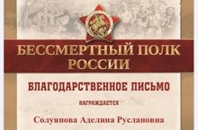 Ученица 9А класса Солуянова Аделина награждена благодарственным письмом за помощь, содействие и поддержку в организации и проведении шествия «Бессмертный полк онлайн», в рамках Республиканского проекта «Шаги Победы - 2020», приуроченное празднованию 75-летия Победы в ВОВ 1941-1945 гг. и Года памяти и славы. Молодец, Аделина! Так держать!