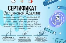 Ученица 8А класса Солуянова Аделина приняла активное участие в Республиканском проекте «Шаги Победы 2020», приуроченный к празднованию 75-летия годовщины Победы в Великой Отечественной войне 1941-1945 гг. и Года памяти и славы. Молодец Аделина! Так держать! Школа гордится тобой!