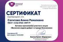 Поздравляем Сагитову Алину Рамилевну как самую активную участницу Республиканской акции "Весенняя неделя добра" в городе Нижнекамск. Молодец, Алина Рамилевна! Школа гордится вами!