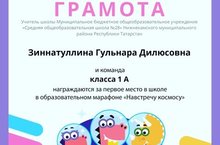 Поздравляем команду 1А класса и классного руководителя Зиннатуллину Гульнару Дилюсовну с грамотой за 1 место в школе в образовательном марафоне "Навстречу космосу". Молодцы! Мы гордимся вами!